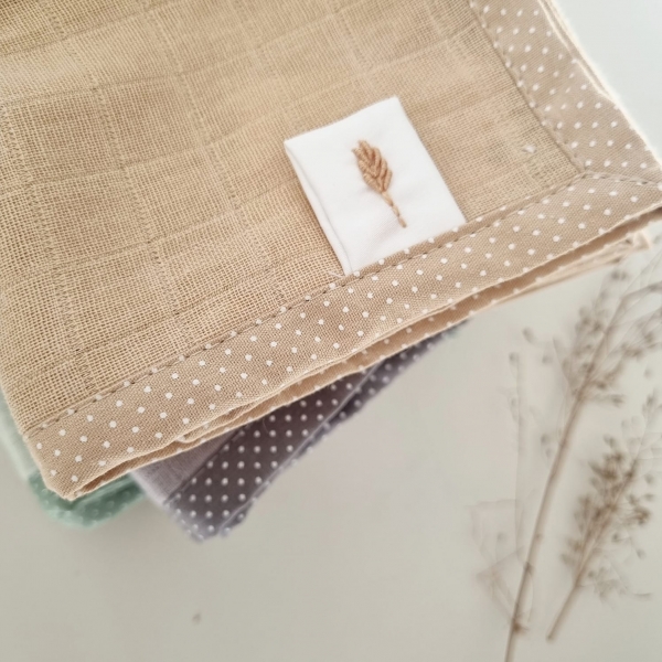 Nossas toalhas de boca são confeccionadas com tecido fralda 100% algodão, com acabamento em viés com estampa poá de tricoline 100% algodão. E tem um detalhe feito à mão que deixa a peça um charme.